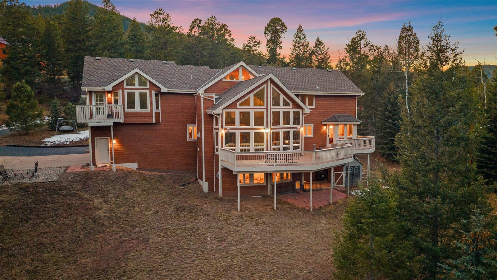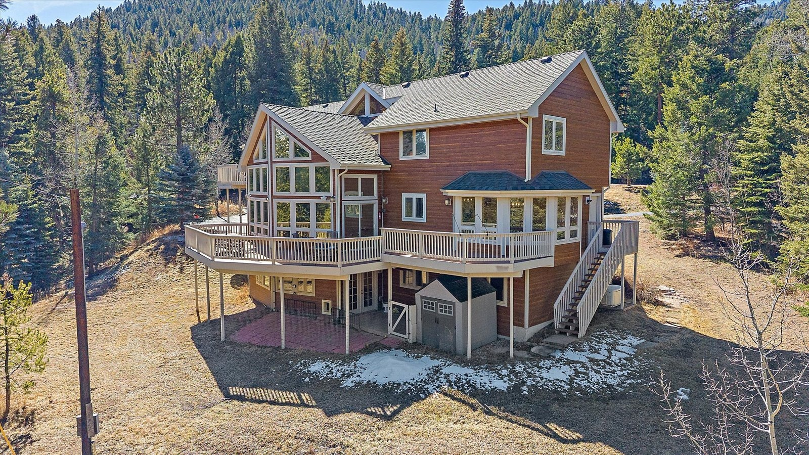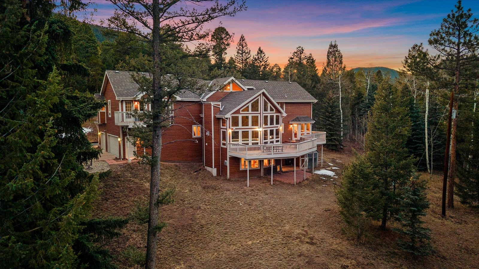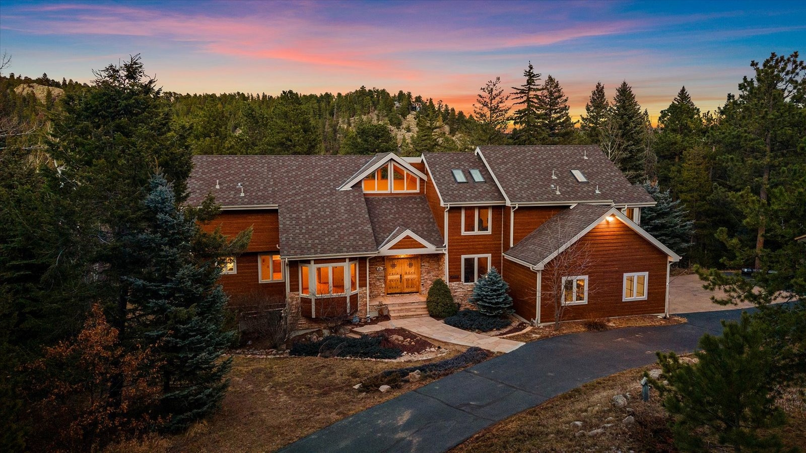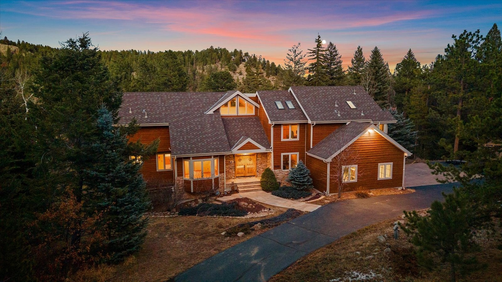 Set on 13.5 private acres, this meticulously maintained home offers a rare combination of thoughtful design, enduring quality, and peaceful seclusion. Every element of the property reflects careful stewardship, creating a home that feels both timeless and exceptionally well cared for. Inside, soaring tongue-and-groove cathedral ceilings with exposed beams create a dramatic architectural centerpiece in the great room, where a wall of windows fills the space with natural light and frames the surrounding landscape like living artwork. A newer upgraded Heat & Glo gas fireplace adds warmth and ambiance, while the expansive wraparound deck invites you to step outside and fully experience the serenity of the setting. The renovated kitchen blends beauty and function with gorgeous new custom-made Alder cabinetry, granite waterfall countertops, stainless steel appliances, and a welcoming island breakfast bar. The primary suite is a private retreat with vaulted ceilings, its own balcony, two large walk-in closets, and a spacious five-piece bath with granite counters and a jetted soaking tub. The finished walk-out lower level offers comfortable guest accommodations with an ensuite bedroom, a welcoming family room with a highly efficient gas stove, and a versatile gym or workshop space with wet bar. Extensive upgrades add long-term confidence and peace of mind, including custom-made Alder cabinetry in the kitchen and all bathrooms, fire-resistant James Hardie cement siding with a transferable warranty, professional fire mitigation, two high-efficiency Trane furnaces, central air conditioning, Class-4 impact-resistant roof, dual water heaters, whole-house humidifier, water softener, and an 11kW Generac generator. This home is located just 1.3 miles from Highway 285 and minutes from Conifer shops, restaurants, and everyday services, with Meyer Ranch Park, Red Rocks Amphitheater, Denver, and Echo Mountain Ski Hill all within easy reach.