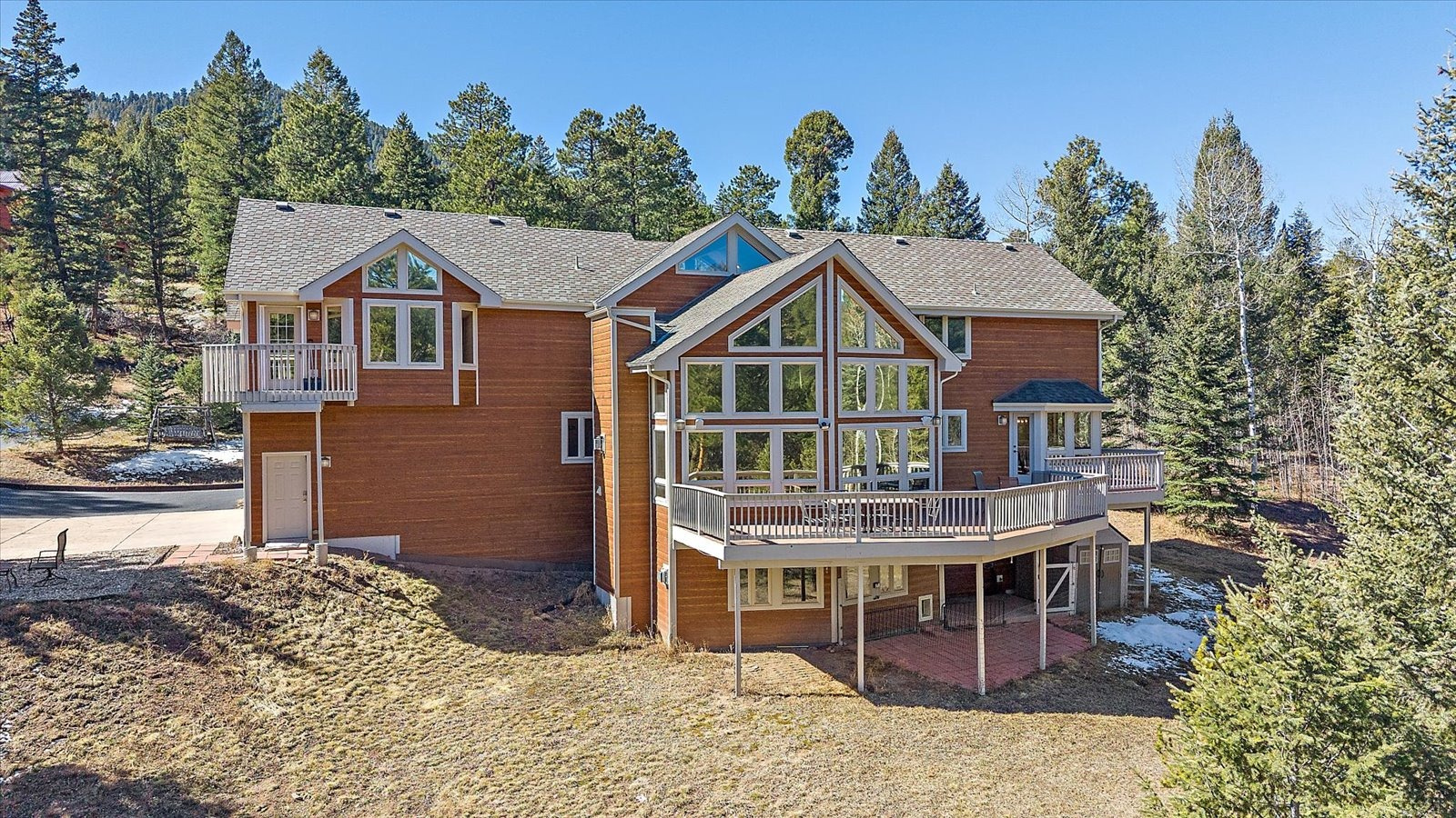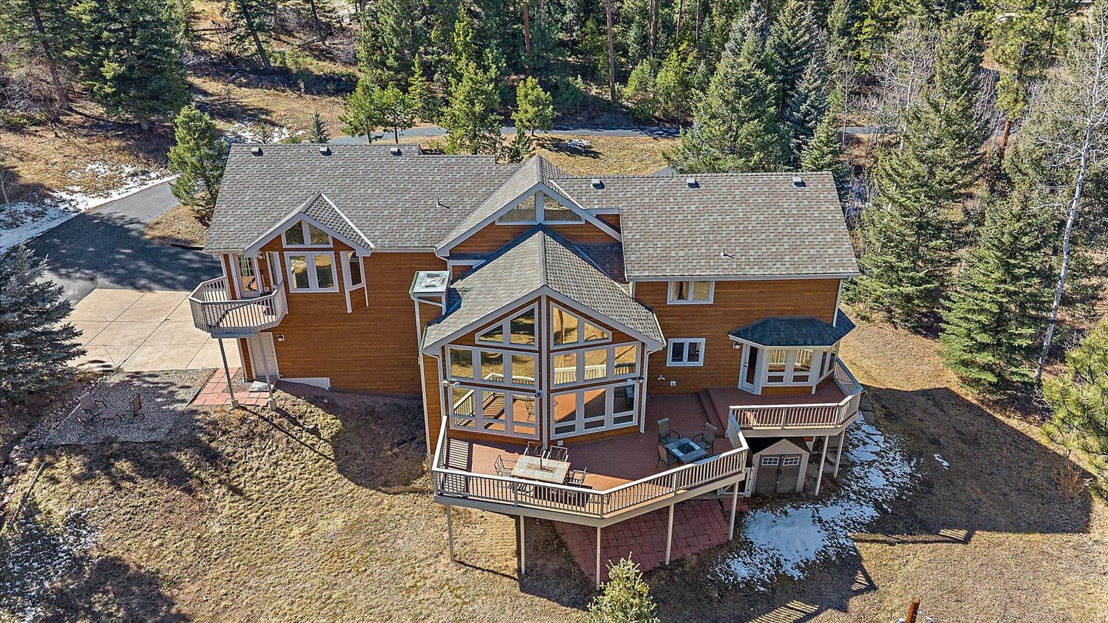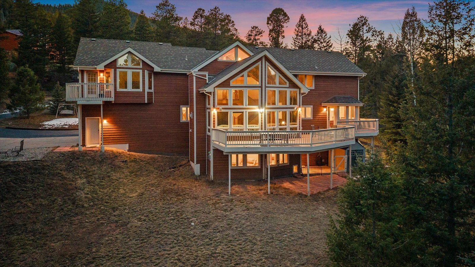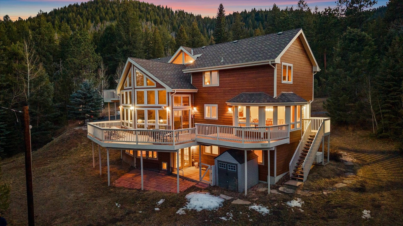 Set on 13.5 private acres, this meticulously maintained home offers a rare combination of thoughtful design, enduring quality, and peaceful seclusion. Every element of the property reflects careful stewardship, creating a home that feels both timeless and exceptionally well cared for. Inside, soaring tongue-and-groove cathedral ceilings with exposed beams create a dramatic architectural centerpiece in the great room, where a wall of windows fills the space with natural light and frames the surrounding landscape like living artwork. A newer upgraded Heat & Glo gas fireplace adds warmth and ambiance, while the expansive wraparound deck invites you to step outside and fully experience the serenity of the setting. The renovated kitchen blends beauty and function with gorgeous new custom-made Alder cabinetry, granite waterfall countertops, stainless steel appliances, and a welcoming island breakfast bar. The primary suite is a private retreat with vaulted ceilings, its own balcony, two large walk-in closets, and a spacious five-piece bath with granite counters and a jetted soaking tub. The finished walk-out lower level offers comfortable guest accommodations with an ensuite bedroom, a welcoming family room with a highly efficient gas stove, and a versatile gym or workshop space with wet bar. Extensive upgrades add long-term confidence and peace of mind, including custom-made Alder cabinetry in the kitchen and all bathrooms, fire-resistant James Hardie cement siding with a transferable warranty, professional fire mitigation, two high-efficiency Trane furnaces, central air conditioning, Class-4 impact-resistant roof, dual water heaters, whole-house humidifier, water softener, and an 11kW Generac generator. This home is located just 1.3 miles from Highway 285 and minutes from Conifer shops, restaurants, and everyday services, with Meyer Ranch Park, Red Rocks Amphitheater, Denver, and Echo Mountain Ski Hill all within easy reach.