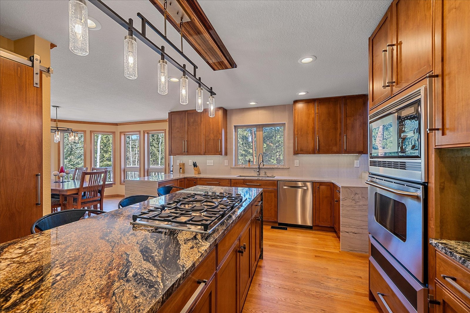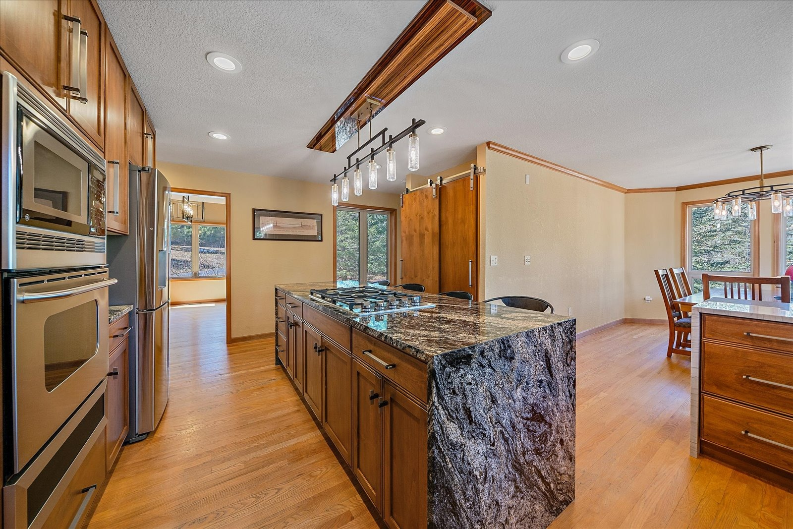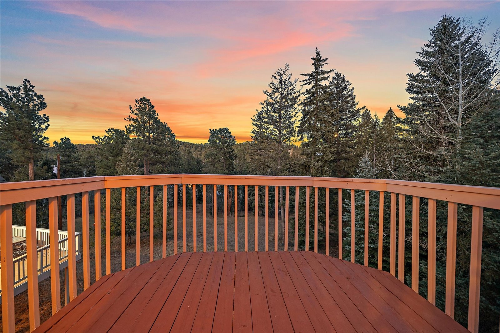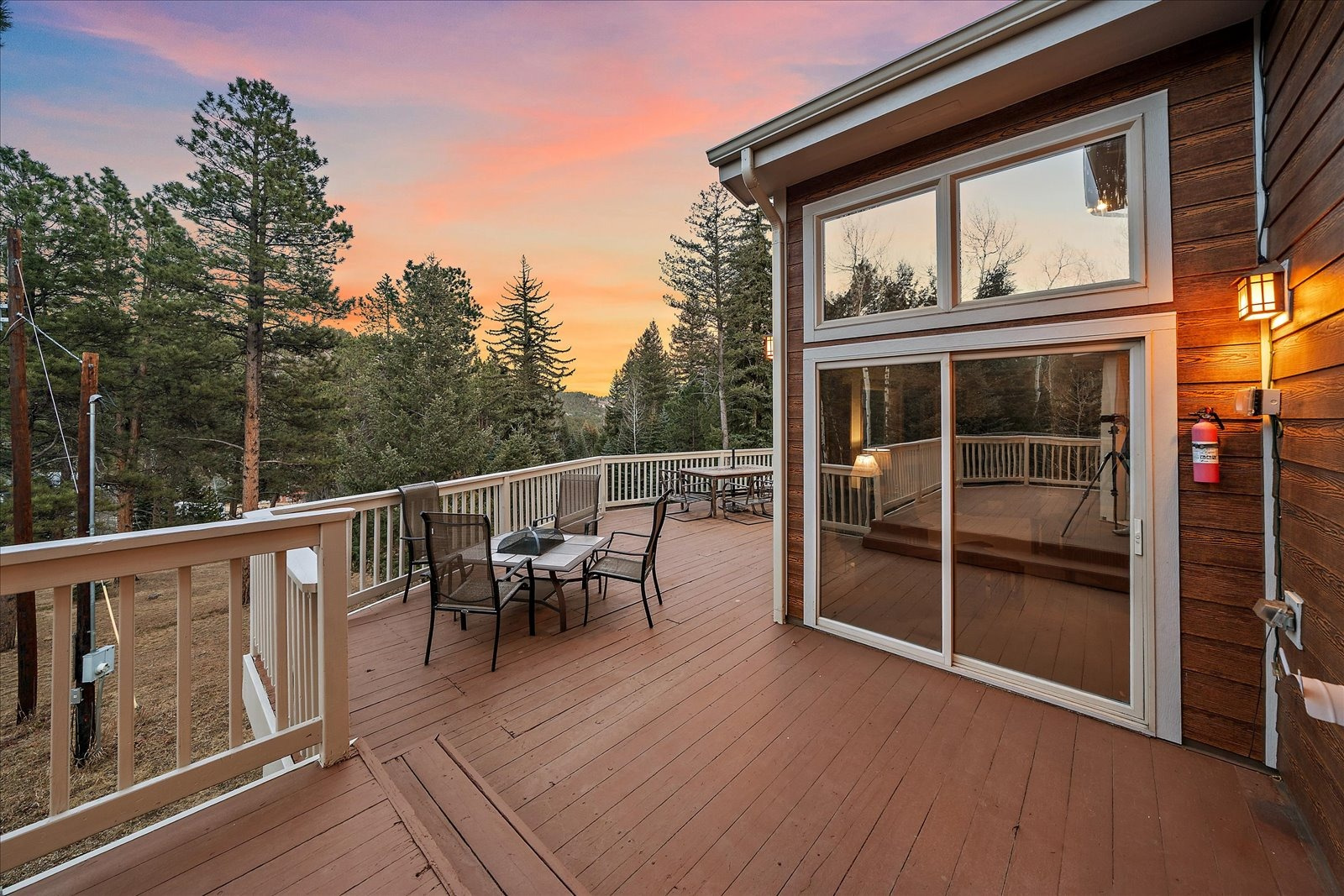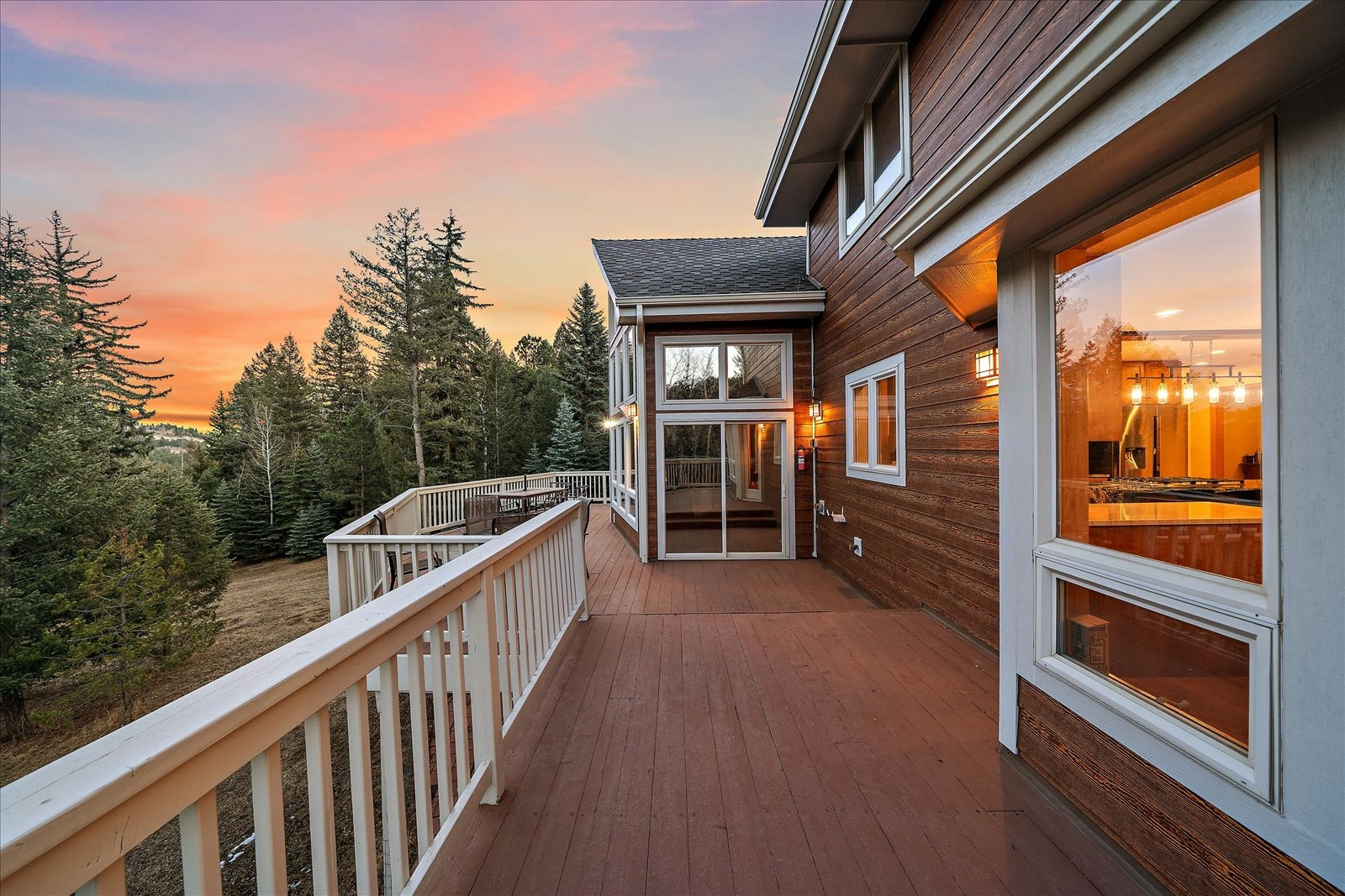 Set on 13.5 private acres, this meticulously maintained home offers a rare combination of thoughtful design, enduring quality, and peaceful seclusion. Every element of the property reflects careful stewardship, creating a home that feels both timeless and exceptionally well cared for. Inside, soaring tongue-and-groove cathedral ceilings with exposed beams create a dramatic architectural centerpiece in the great room, where a wall of windows fills the space with natural light and frames the surrounding landscape like living artwork. A newer upgraded Heat & Glo gas fireplace adds warmth and ambiance, while the expansive wraparound deck invites you to step outside and fully experience the serenity of the setting. The renovated kitchen blends beauty and function with gorgeous new custom-made Alder cabinetry, granite waterfall countertops, stainless steel appliances, and a welcoming island breakfast bar. The primary suite is a private retreat with vaulted ceilings, its own balcony, two large walk-in closets, and a spacious five-piece bath with granite counters and a jetted soaking tub. The finished walk-out lower level offers comfortable guest accommodations with an ensuite bedroom, a welcoming family room with a highly efficient gas stove, and a versatile gym or workshop space with wet bar. Extensive upgrades add long-term confidence and peace of mind, including custom-made Alder cabinetry in the kitchen and all bathrooms, fire-resistant James Hardie cement siding with a transferable warranty, professional fire mitigation, two high-efficiency Trane furnaces, central air conditioning, Class-4 impact-resistant roof, dual water heaters, whole-house humidifier, water softener, and an 11kW Generac generator. This home is located just 1.3 miles from Highway 285 and minutes from Conifer shops, restaurants, and everyday services, with Meyer Ranch Park, Red Rocks Amphitheater, Denver, and Echo Mountain Ski Hill all within easy reach.